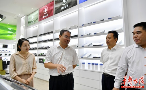 张家界市委副书记、市长刘革安视察茅岩河镇莓茶知名品牌大米雪茶销售展示区。