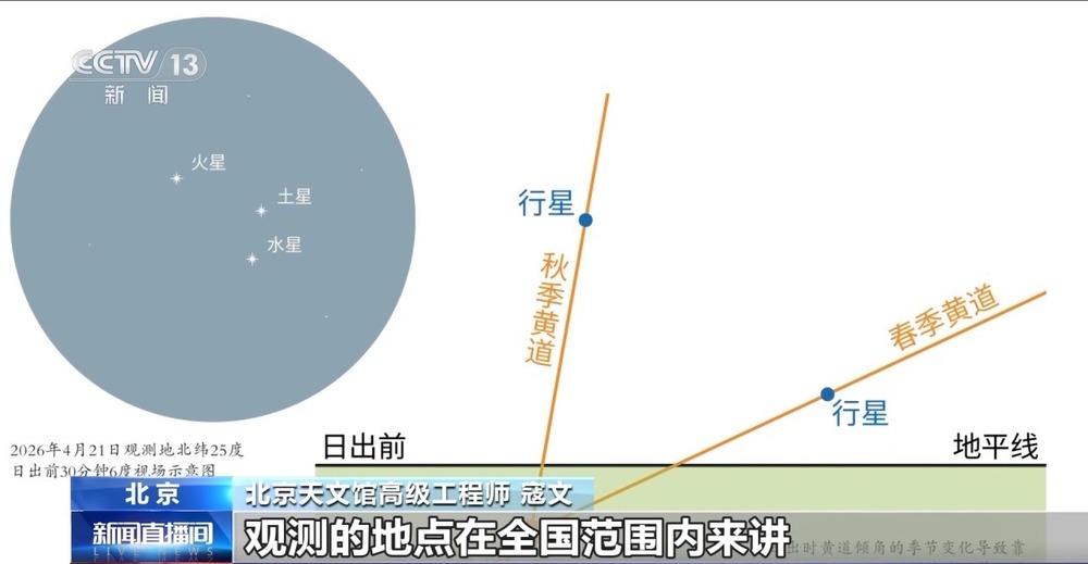 地理科普专业的人介绍,本次三星会聚时,火星与土星亮度安稳,水星刚过西大距,三者方位邻近、层次明晰,在天幕上构成紧凑星群,视觉效果杰出,便于辨认与观测。不过,由于行星升起后不久就会遭到晨光的影响,可见时刻较短。主张挑选远离城市灯火污染、东方视界彻底开阔的场所,在日出前40~60分钟进行观测。