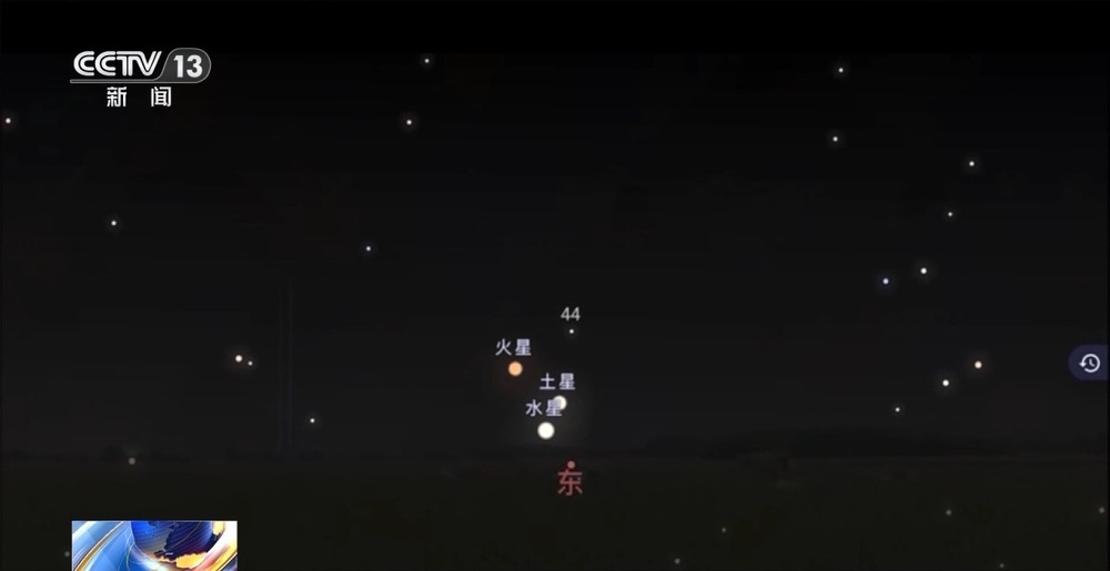 水星、火星还有土星,它们在早晨天亮曾经升出东方地平线,那么三个天体间隔散布在大约不到2度的一个范围内,这个间隔是十分小的了。